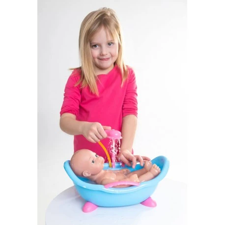 Amia Puppenbadewanne mit Funktion, inklusive einer Puppe mit einer Größe von ca. 30 cm. Der Duschkopf funktioniert ganz einfache per Druck auf den Pumpknopf und ganz ohne Batterie. Einfach Wasser in die Badewanne füllen und los geht. Bis zu ca. 1 Liter passen in die Badewanne. Inklusive einer Badeente und einer Flasche. Maße ca. 32x21x13 cm. Für Kinder ab 3 Jahren..