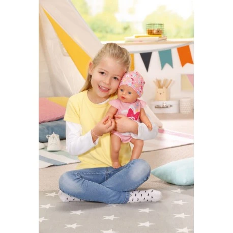 ‚Das Mädchen will einfach nicht verstehen, warum es schon ins Bett muss. Es ist doch noch hell draußen. Mama und Papa haben da jetzt einen tollen Trick: einfach den Schuller im Mund drehen, schon gehen die Augen zu und es ist dunkel. Wenn das mit jedem Baby so einfach wäre Durch Drehen des Schnullers öffnet und schließt die Puppe die Augen. Egal in welcher Position sich ihr Körper befindet. Darüber hinaus hat das Girl Schlafaugen. Legt man sie ohne Schnuller auf den Rücken, schließt sie die Augen automatisch. Schlafen, Baden und Essen sind des Girls Lieblingsbeschäftigungen. Sie trinkt gerne Wasser aus ihrem Fläschchen und kann dann Pipi in die Windel oder ins Töpfchen machen und echte Puppentränen weinen. Neben Wasser steht der BABY born Brei auf dem Speiseplan. Dann macht sie sogar ihr großes Geschäft. Ihre Arme, Beine und der Kopf sind super beweglich, so dass das An- und Ausziehen der trendigen Kleidung zum Kinderspiel wird. Der Soft Touch Körper ist angenehm weich. 10 Accessoires, die ihre Funktionen unterstützen, ein rosa Body und ein Mützchen gehören zur Erstausstattung. BABY born Magic Mit 10 lebensechten Funktionen für große Spielfreude. Das abwechslungsreiche (Rollen-)Spiel mit BABY born fördert die Fantasie und unterstützt nachweislich die Entwicklung sozialer Fähigkeiten und Werte wie Verantwortung, Kommunikation und Einfühlungsvermögen. Der Schnuller passt jeder BABY born Puppe in 43cm. Die Augen-Funktion des Schnullers geht nur in Verbindung mit BABY born Magic. Benötigt keine Batterien. BABY born Magic Girl 43cm mit Body und Mütze. Inklusive 1 Töpfchen, 1 Windel, 1 Teller mit Löffel, 1 Portion Brei, 1 Flasche, 1 magischer Schnuller, 1 Geburtspass und je 1 Freundschaftsbändchen für Kind und Puppe.“.