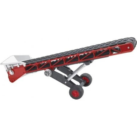 “Förderbänder erleichterten den Menschen besonders den Transport von Schüttgütern wie Sand, Kies, usw. Im landwirtschaftlichen Bereich werden sie auch für Strohballen, Holzscheite, also Festkörpern, gern benutzt. Um unseren kleinen Baumeistern und Landwirten die schwere Arbeit einfacher zu machen bringt BRUDER ein modernes Förderband auf den Markt. Das Arbeitsgerät besticht durch seine gelungene Optik und den mittels Drehknöpfen und Kurbel sehr einfach zu bedienenden Hub- und Fördermechanismen. Damit können Heuballen auf den Wagen transportiert und in die Scheune eingebracht werden, Sand oder Steinchen auf LKWs befördert aber auch entladen werden. Das Förderband lässt sich an alle BRUDER Zugfahrzeuge wie Traktoren, Unimogs, LKWs inkl. dem Sprinter aber auch an Baufahrzeuge, die über eine Anhängerkupplung verfügen, anhängen.“.