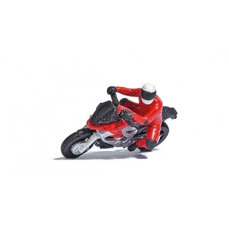 Action Set für die realistische Belebung Ihrer Modellwelt. Modernes Motorrad (rot) mit Fahrer in rasanter Kurvenfahrt. Mit 3 Leitplanken und 8 Begrenzungspfosten..