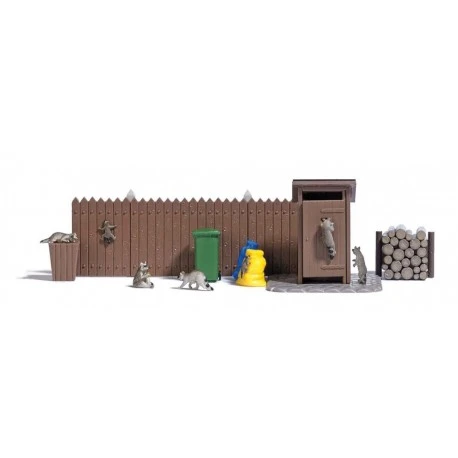 Action Set für die realistische Belebung Ihrer Modellwelt. 5 ausgewachsene und 2 junge Waschbären in unterschiedlichen Positionen. Mit reichhaltigem Zubehör zur Gestaltung von kompletten Szenen: Toilettenhäuschen, Holzzaun, Holzstapel, Abfallkorb, Mülltonne und Müllsäcke..