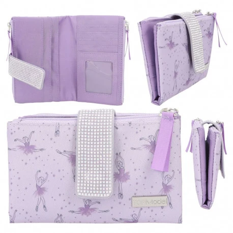 Das lila TOPModel-Portemonnaie hat außen ein supersüßes Ballerina-Allover und eine Verschluss-Lasche, die über und über mit Glitzersteinen besetzt ist. Innen mit Reißverschluss-Münzfach und diversen Kartenfächern (inkl. Namenskartenfach mit transparentem Fenster). Material: 100 Prozent Polyester Besatz: PU.
