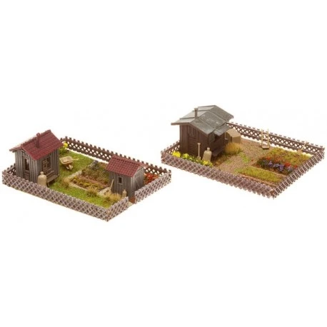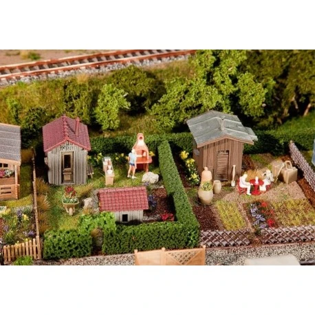 “Charakteristische Schrebergärten, die einzeln baubar sind und auch zu einer größeren Siedlung erweitert werden können.Sehr häufig in Bahn- oder Flußnähe anzutreffen.Das Set wird ergänzt durch zwei schöne PREMIUM Landschafts-Segmente und typisches Zubehör.“.