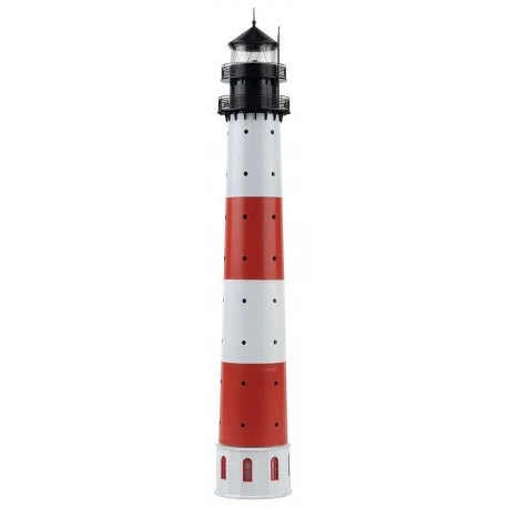 “Wahrzeichen des Nordens. Nachbildung des 1908 in Betrieb genommenen Leuchtturms »Westerheversand« auf der Halbinsel Eiderstedt in Schleswig-Holstein. Der rot-weiß geringelte Watt-Riese, der sich im Inneren über neun Stockwerke erstreckt, gilt als der bekannteste Leuchtturm Deutschlands.Das Modell ist mit einem in regelmäßigen Abständen leuchtenden See- und Orientierungsfeuer (Blitzfeuer) ausgestattet. Der Anschluss erfolgt an 12-16 V, Gleichspannung.“.