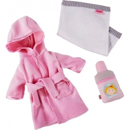 Mit diesem Kleiderset sind die Puppenlieblinge nach dem Baden passend angezogen. Der Bademantel ist kuschelig-weich und mit dem Gürtel schnell zugebunden. Besonders praktische Accessoires sind das niedliche Handtuch und das Shampoo..