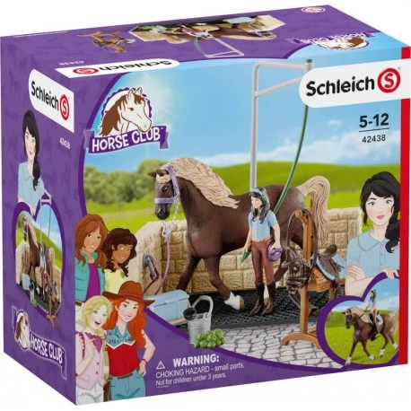 Am Waschplatz mit Horse Club Emily & Luna von Schleich® Horse Club macht Emily ihre Holsteiner Stute Luna nach dem Training sauber und freut sich über den praktischen Sattelbock..