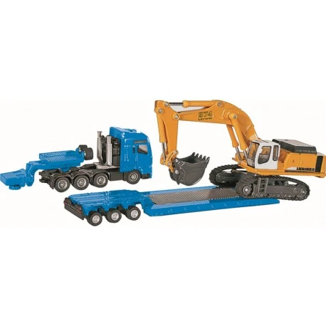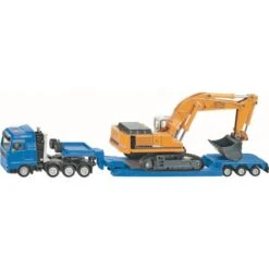 Detailliertes Spielzeugmodell eines Schwertransport mit Tiefbettauflieger und Liebherr Großbagger mit Tieflöffel zum Spielen und Sammeln – Umfangreiche Funktionen: Abkoppelbarer Auflieger, Zugmaschine mit anderen Anhängern im gleichen Maßstab kombinierbar, Beweglicher Baggerarm sowie Schaufel – Langanhaltender Spielspaß durch unzählige Kombinationsmöglichkeiten innerhalb der SIKU Spielwelt – Ideal als Geschenk für kleine und große LKW- und Bagger-Fans geeignet, Perfekte Ergänzung zu SIKU Spielwelten – Lieferumfang: 1x SIKU 1834 Schwertransport mit Auflieger und Bagger, Maßstab: 1:87, Material: Metall/Kunststoff, Abmessungen: 27,5 x 5,5 x 8,1 cm, Gewicht: 0,37 kg, Farbe: Blau(Gelb, Serie: SIKU SUPER.