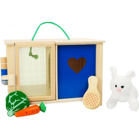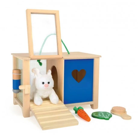 Hier lernen Kinder, Verantwortung für ihre Haustiere zu tragen! Aus Massiv- und Schichtholz gearbeitet ist dieser tolle Stall mit Zubehör. Über eine Klappe können Kinder in den Stall greifen und den niedlichen Hasen füttern, ihn bürsten und sein Trinkwasser auffüllen. Eine kleine Rampe hilft dem Langohr beim Ein- und Ausstieg, das herzförmige Fenster rundet das liebevolle Design ab. Drei Seiten aus Plexiglas bringen Licht in den kleinen Stall.