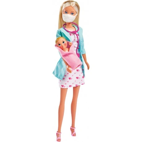Steffi als Kinderärztin mit Mundschutz und viel Zubehör, Baby mit Fieber. Ca. 29 cm. Ab 3 Jahren..