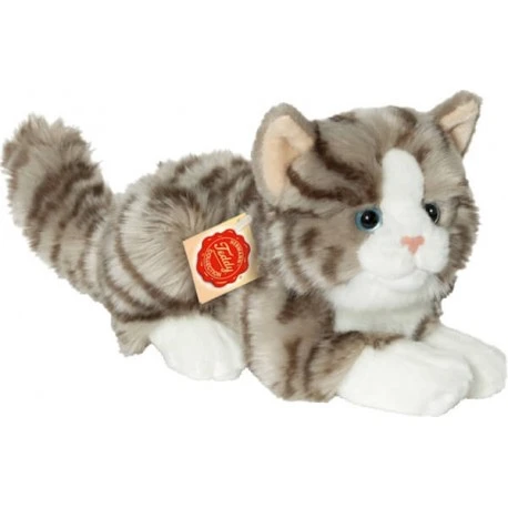 Katze liegend grau 20 cm aus der Teddy Hermann® Collection aus hochwertigem Plüsch gefertigt und mit weicher Polyesterwatte gefüllt. 30 Grad waschbar, Schonwäsche. Nicht in den Trockner..
