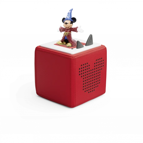 Anlässlich des 100-jährigen Jubiläums von Disney bringt tonies® eine limitierte Auflage der roten Toniebox mit einer Perforation des Kopfes von Disney Mickey-Mouse und dem exklusiven Disney Fantasia Tonie (Mickey Mouse mit Sternenmantel) heraus.