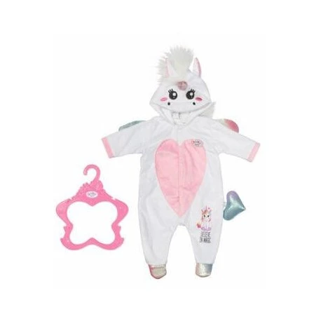 “Verkleiden steht bei BABY born hoch im Kurs. Aktuell ist der Einhorn-Onesie ihr Lieblingsteil. Damit träumt sie sich ins Land der zauberhaften Feen und magischen Einhörner. Die Kapuze des weißen Overalls ist wie der Kopf eines Einhorns gestaltet. Über dem putzigen Gesicht befindet sich ein glitzerndes Horn zwischen knuffeligen Öhrchen. Am Scheitel entlang verläuft eine weiße Mähne. Die am Rücken angenähten Flügelchen schimmern in allen möglichen Regenbogenfarben, genauso wie der herzige Schwanz. Das rosa Herz auf der Vorderseite zeigt BABY borns innige Verbindung zu allen, die an Magie glauben| so wie das aufgedruckte Einhorn am linken Bein. •.