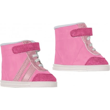 “BABY born schleicht seit neustem wie ein kleiner pinker Panther durchs Kinderzimmer. Die leisen Sohlen, sowie die weißen Schnürsenkel harmonieren prima mit der Farbgebung der Turnschuhe. Die Sneakers sind Ton in Ton in Rosa gehalten. Das Schuhmaterial, die Streifen, das Klettband und die Fußspitzen weichen nur in Nuancen voneinander ab. Natürlich darf ein bisschen Glitzer auf dem Pink nicht fehlen. Die Schuhe sind knöchelhoch und geben der kleinen Entdeckerin sicheren Halt auf ihren Streifzügen. •.